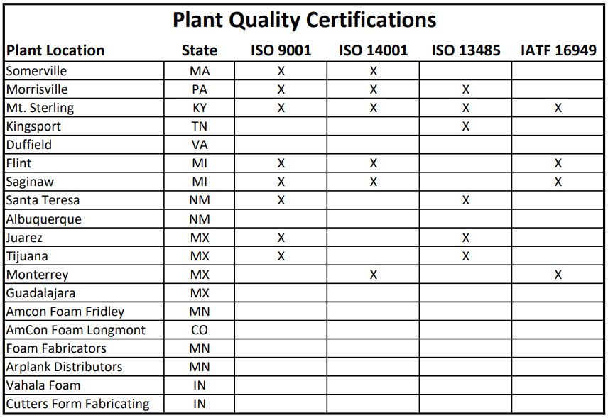 Rogers Foam has invested significantly in quality management and today has mature and robust quality systems in place. Our automotive plants have earned the IATF 16949 certification. Our medical plants have achieved ISO 13485 certification. Below is a complete list of our quality certifications by plant: